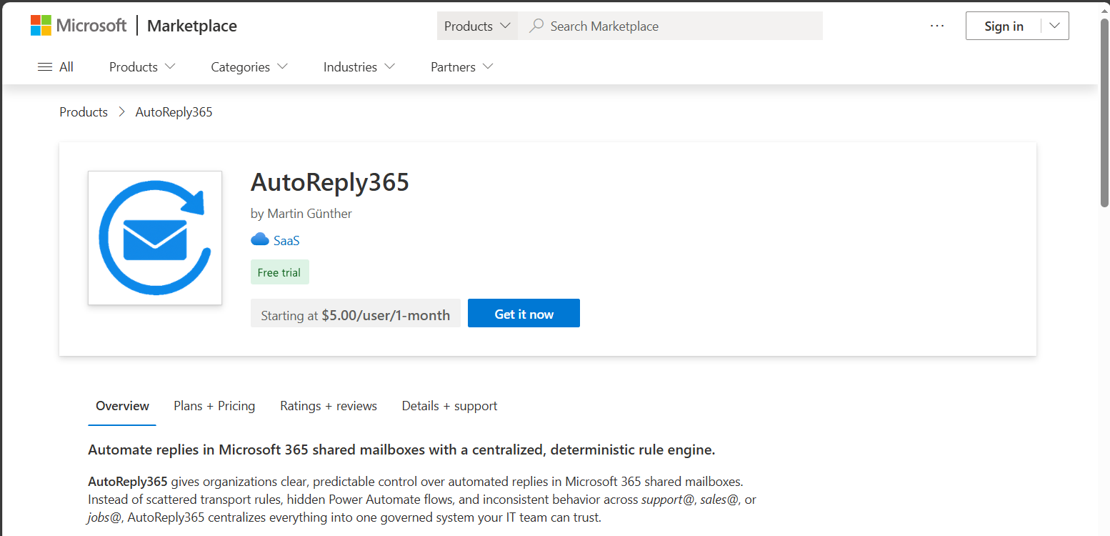 - Open the AutoReply365 listing from the Microsoft Marketplace